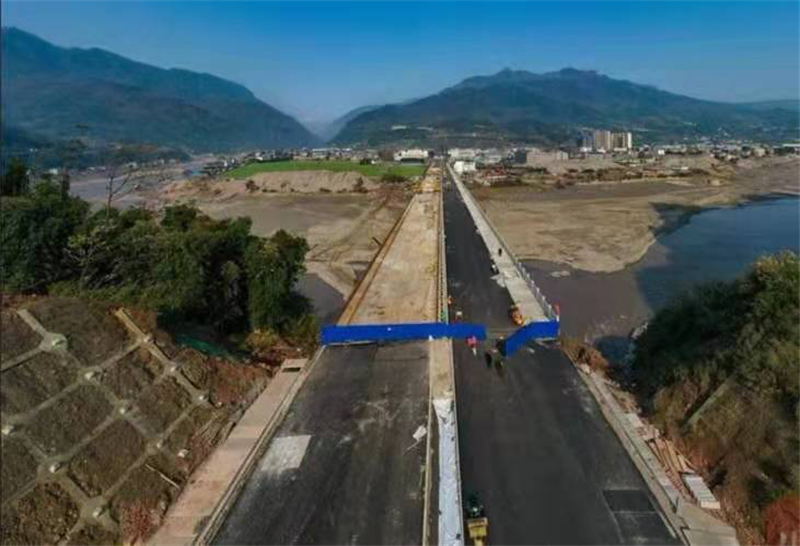 12月24日,雅安多營青衣江大橋已貫通的半幅橋面和兩端引道已完成路面鋪設和護欄安裝,另半幅橋面完成澆筑,開始橋面鋪設,大橋即將
