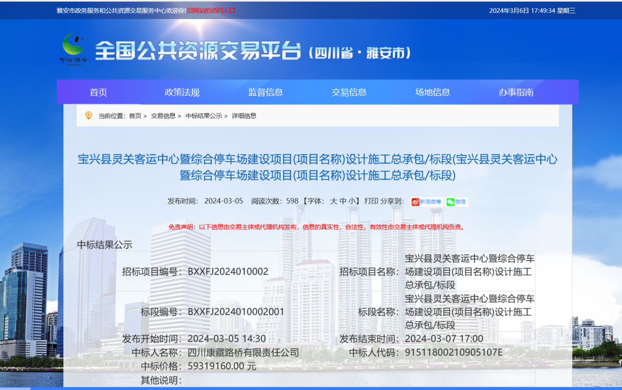 喜訊!雅安交建集團(tuán)康藏路橋公司中標(biāo)寶興縣靈關(guān)客運(yùn)中心暨綜合停車場建設(shè)項(xiàng)目