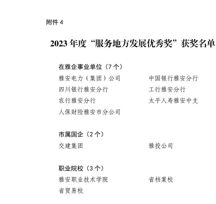 近日,中共雅安市委辦公室、雅安市人民政府辦公室印發(fā)《關(guān)于2023年度縣(區(qū))、市級(jí)部門和單列考評(píng)單位目標(biāo)績(jī)效綜合考評(píng)結(jié)果的通報(bào)》,雅安交建集團(tuán)獲得2023年度“服務(wù)地方發(fā)展優(yōu)秀獎(jiǎng)”。
