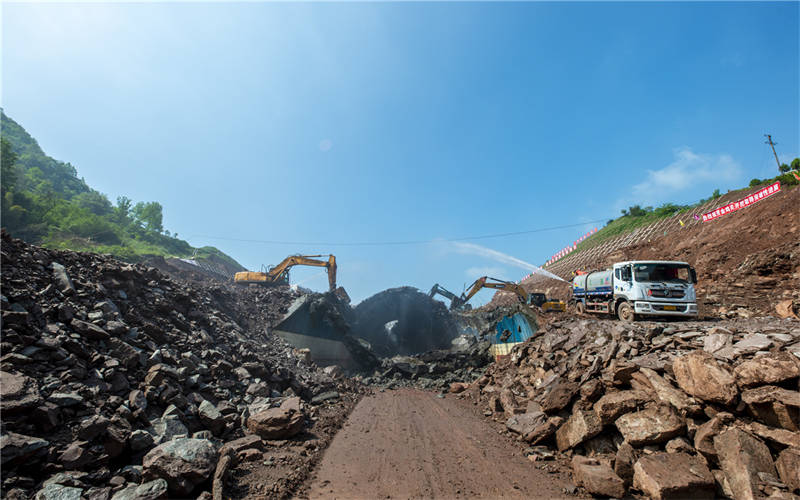 上午10點(diǎn),金雞關(guān)隧道開挖現(xiàn)場,多臺大型破碎機(jī)和灑水除塵設(shè)備同時按下啟動鍵,建設(shè)的“沖鋒號”奏響。金雞關(guān)隧道開挖是整個項目取得突破性進(jìn)展的標(biāo)志,是路基鋪設(shè)和邊坡抗滑裝等施工開展的基礎(chǔ)。目前土方開挖已完成365萬方,邊坡施工已完成8級,項目整體推進(jìn)有序,預(yù)計兩個月完成隧道部分開挖。