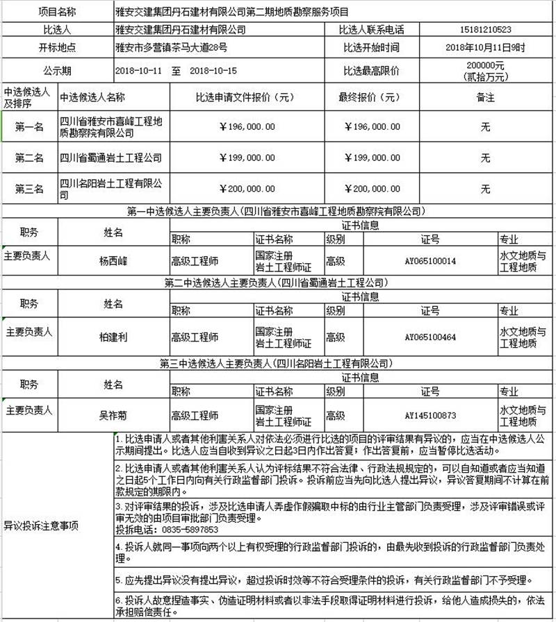 雅安交建集團丹石建材有限公司第二期地質(zhì)勘察服務項目比選公示