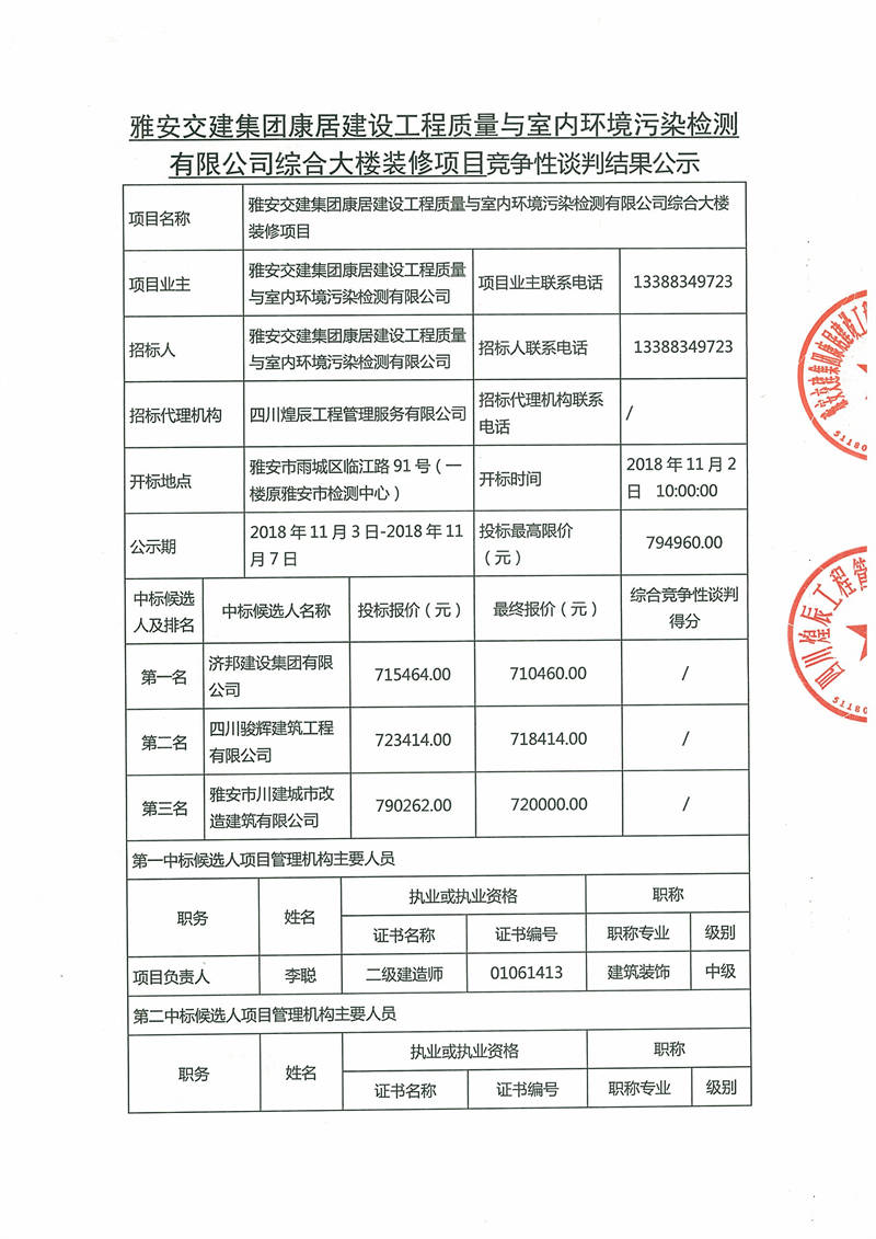 雅安交建集團(tuán)康居建設(shè)工程質(zhì)量與室內(nèi)環(huán)境污染檢測有限公司綜合大樓裝修項(xiàng)目競爭性談判結(jié)果公示