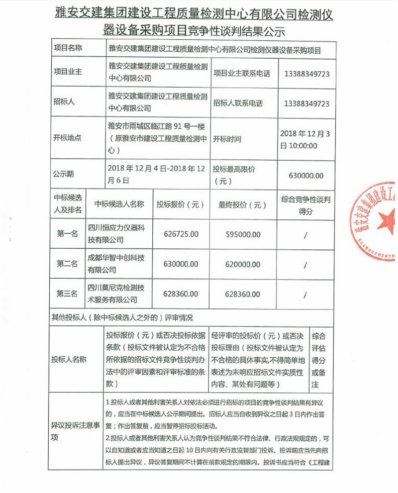 雅安交建集團(tuán)建設(shè)工程質(zhì)量檢測(cè)中心有限公司檢測(cè)儀器設(shè)備采購項(xiàng)目競(jìng)爭(zhēng)性談判結(jié)果公示