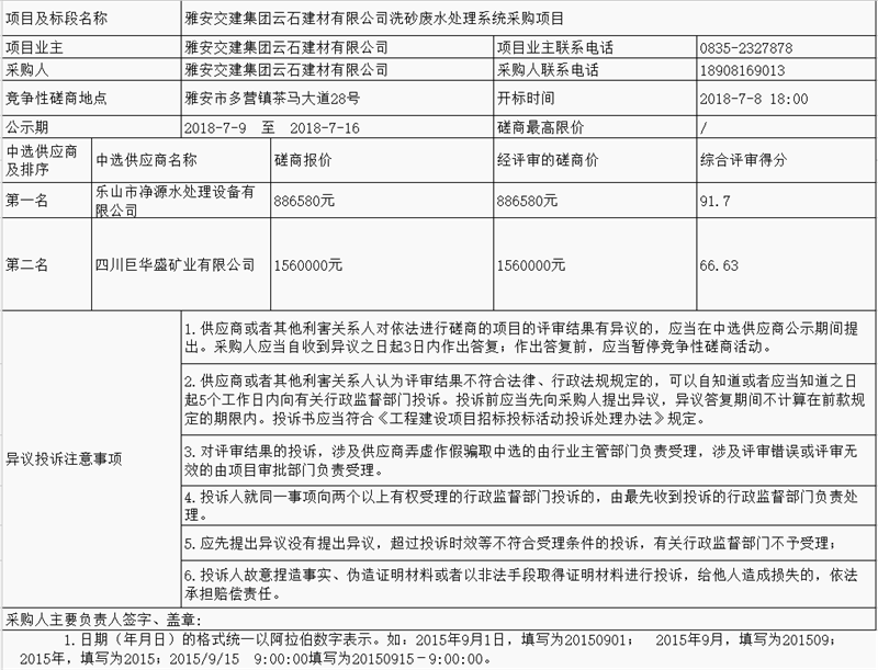 雅安交建集團(tuán)云石建材有限公司洗砂廢水處理系統(tǒng)采購項目中選供應(yīng)商公示