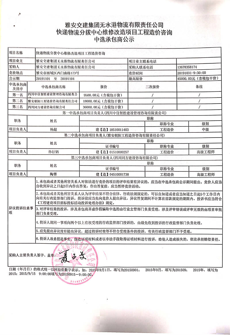 雅安交建集團(tuán)無水港物流有限責(zé)任公司快遞物流分撥中心維修改造項目工程造價咨詢中選承包商公示