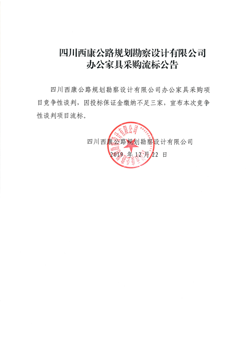 四川西康公路規(guī)劃勘察設計有限公司辦公家具采購流標公告