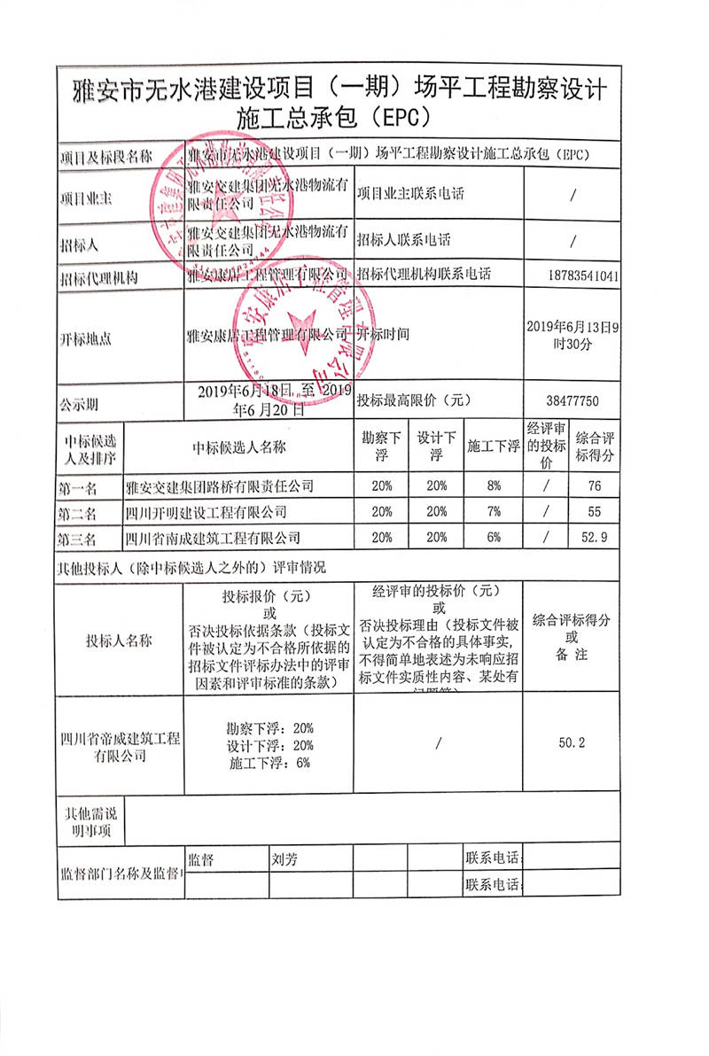 雅安市無水港建設項目(一期)場平工程勘察設計施工總承包(EPC)公開招標結果公示