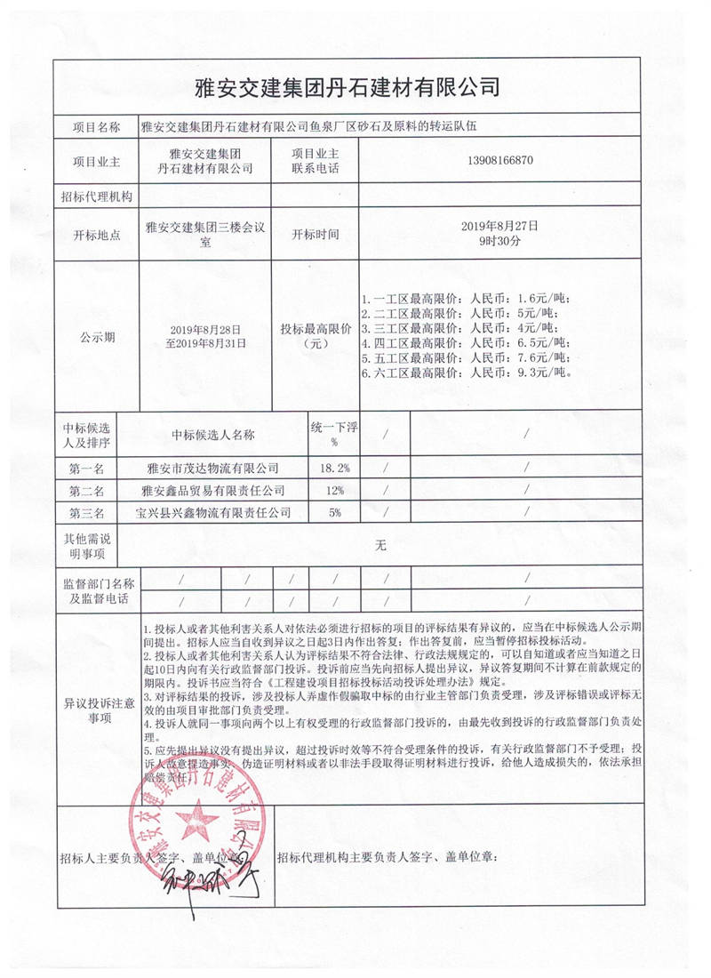 雅安交建集團(tuán)丹石建材有限公司魚(yú)泉廠(chǎng)區(qū)砂石及原料的轉(zhuǎn)運(yùn)隊(duì)伍項(xiàng)目競(jìng)價(jià)結(jié)果公示