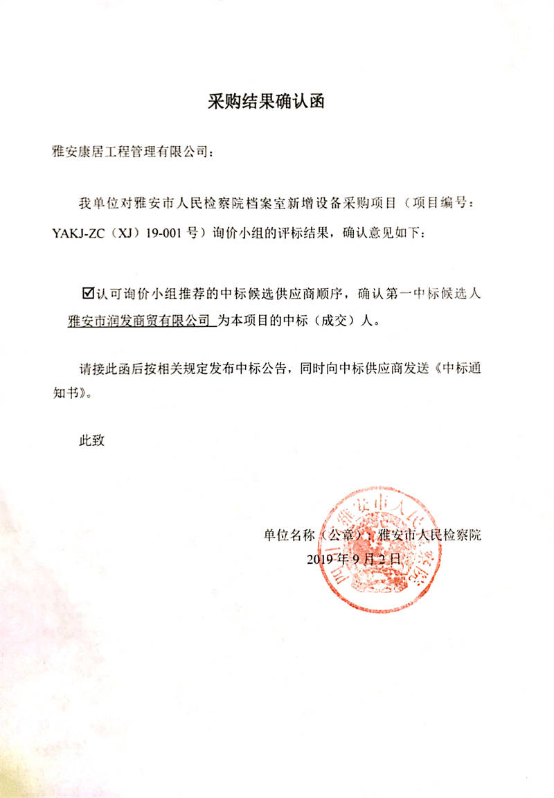 雅安市人民檢察院檔案室新增設(shè)備采購項目結(jié)果公示
