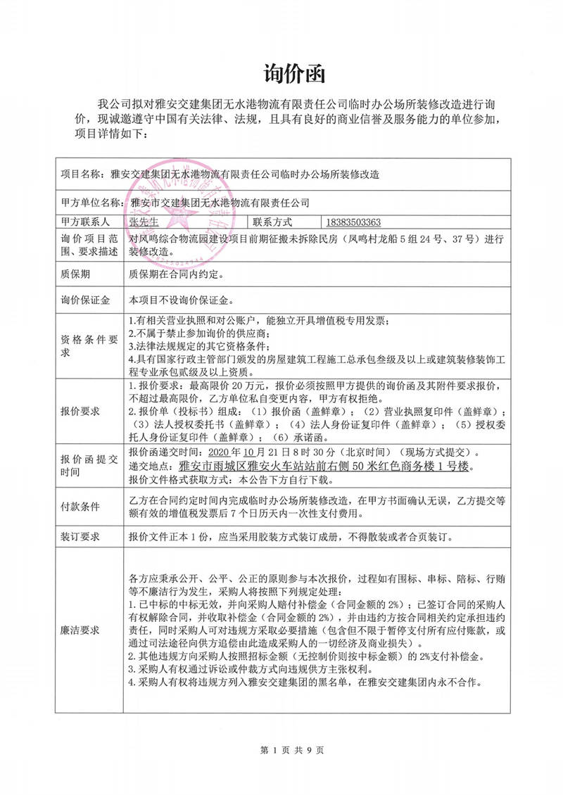 雅安交建集團(tuán)無水港物流有限責(zé)任公司臨時辦公場所裝修改造詢價函