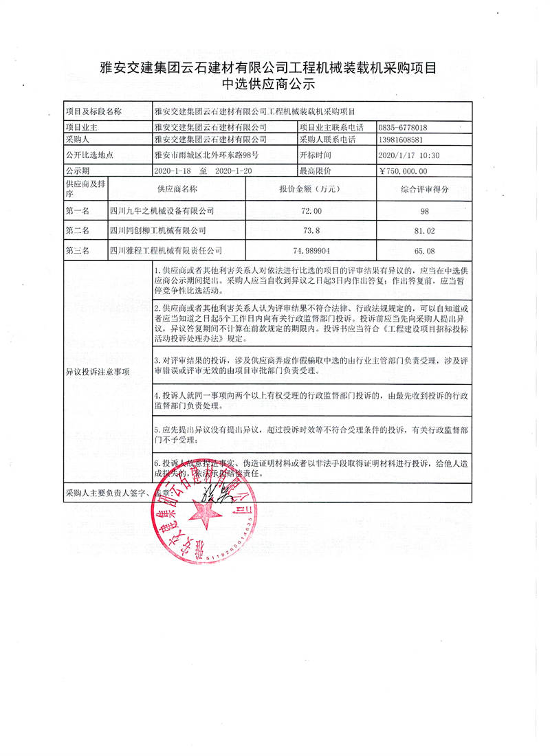 雅安交建集團(tuán)云石建材有限公司工程機(jī)械裝載機(jī)采購(gòu)項(xiàng)目中選供應(yīng)商公示