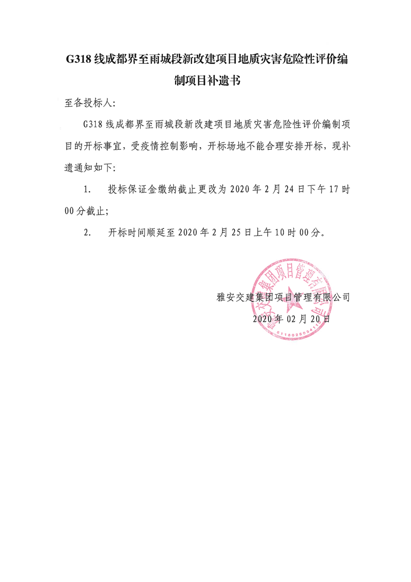 雅安交建集團項目管理有限公司G318線成都界至雨城段新改建項目地質(zhì)災害危險性評價編制項目補遺書