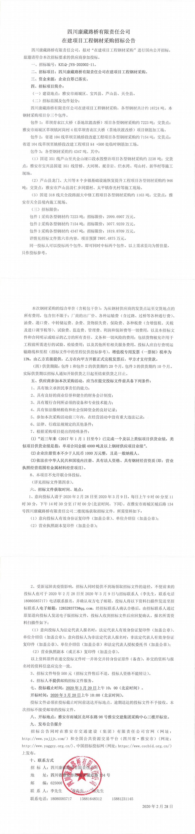 四川康藏路橋有限責(zé)任公司在建項(xiàng)目工程鋼材采購(gòu)招標(biāo)公告