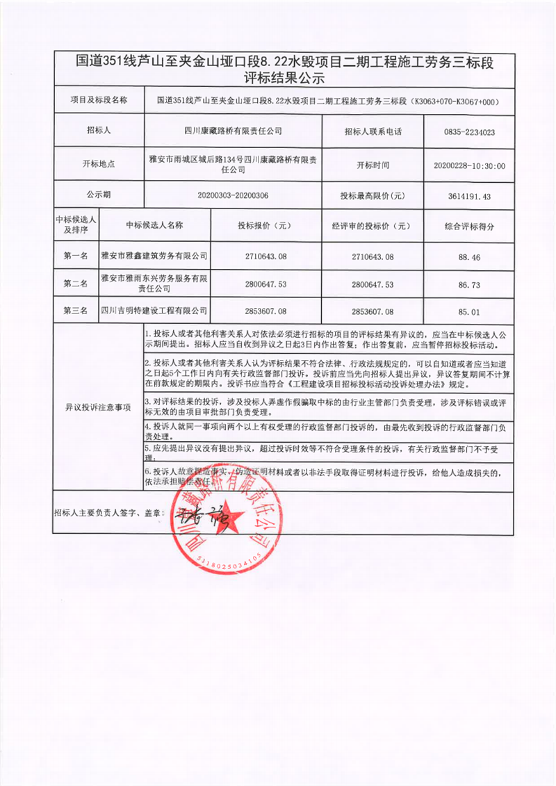 四川康藏路橋有限責(zé)任公司國道351線蘆山至夾金山埡口段8.22水毀項目二期工程施工勞務(wù)三標(biāo)段評標(biāo)結(jié)果公示