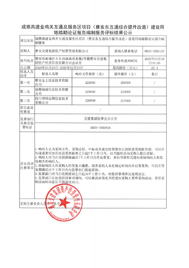 雅安交建集團資產(chǎn)經(jīng)營管理有限公司成雅高速金雞關互通及服務區(qū)項目(雅安東互通綜合提升改造)建設用地踏勘論證報告編制服務評標結果公示