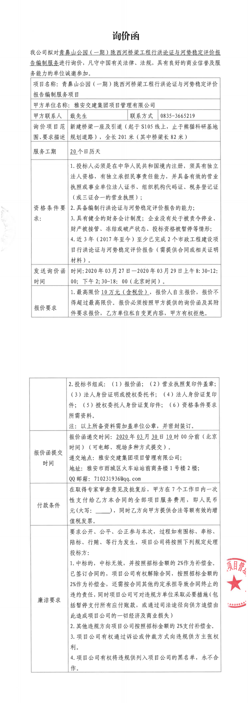 雅安交建集團項目管理有限公司青鼻山公園(一期)隴西河橋梁工程行洪論證及河勢穩(wěn)定評價報告編制服務(wù)項目詢價函