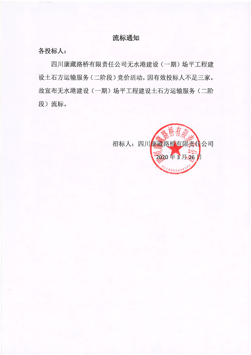四川康藏路橋有限責(zé)任公司無(wú)水港建設(shè)(一期)場(chǎng)平工程建設(shè)土石方運(yùn)輸服務(wù)(二階段)流標(biāo)通知