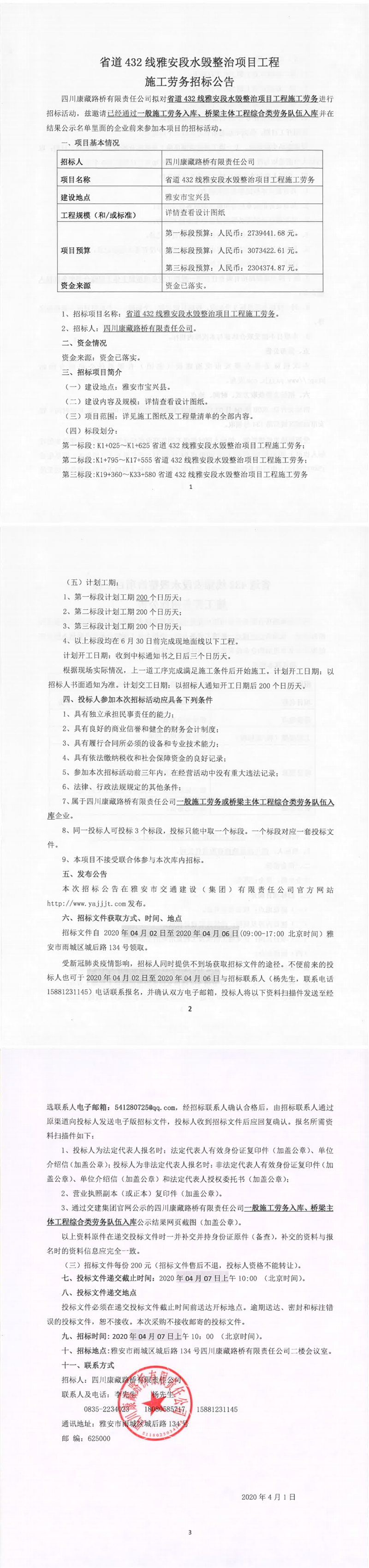 四川康藏路橋有限責(zé)任公司省道432線雅安段水毀整治項(xiàng)目工程施工勞務(wù)招標(biāo)公告