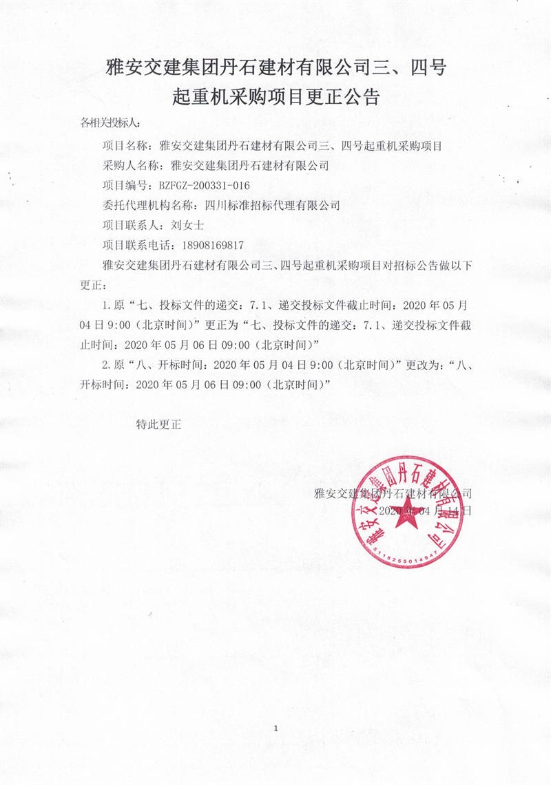 雅安交建集團丹石建材有限公司三、四號起重機采購項目更正公告