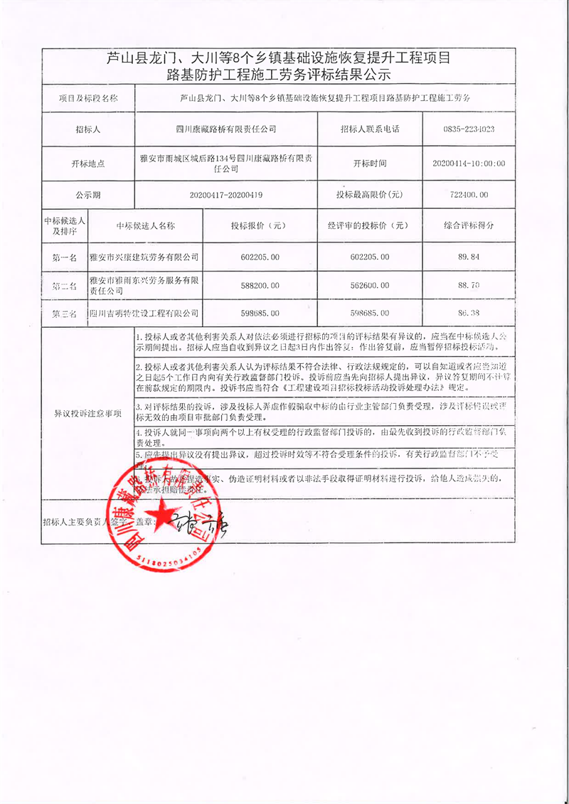 四川康藏路橋有限責(zé)任公司蘆山縣龍門、大川等8個鄉(xiāng)鎮(zhèn)基礎(chǔ)設(shè)施恢復(fù)提升工程項(xiàng)目路基防護(hù)工程施工勞務(wù)評標(biāo)結(jié)果公示