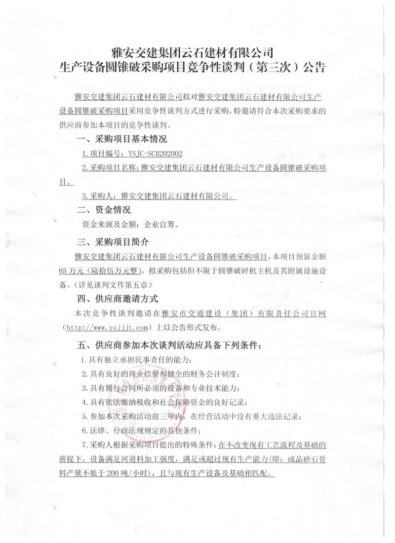 雅安交建集團(tuán)云石建材有限公司生產(chǎn)設(shè)備圓錐破采購項(xiàng)目競(jìng)爭性談判(第三次)公告