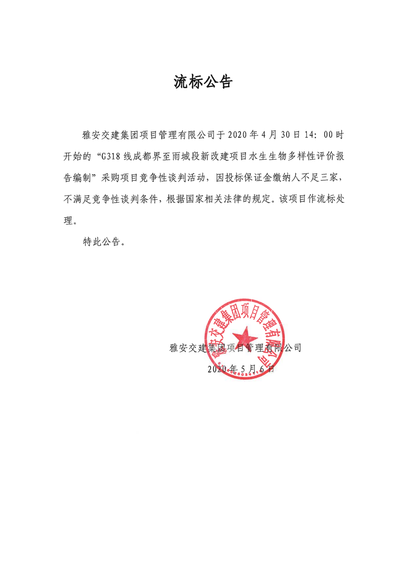 雅安交建集團項目管理有限公司G318線成都界至雨城段新改建項目水生生物多樣性評價報告編制流標(biāo)公告