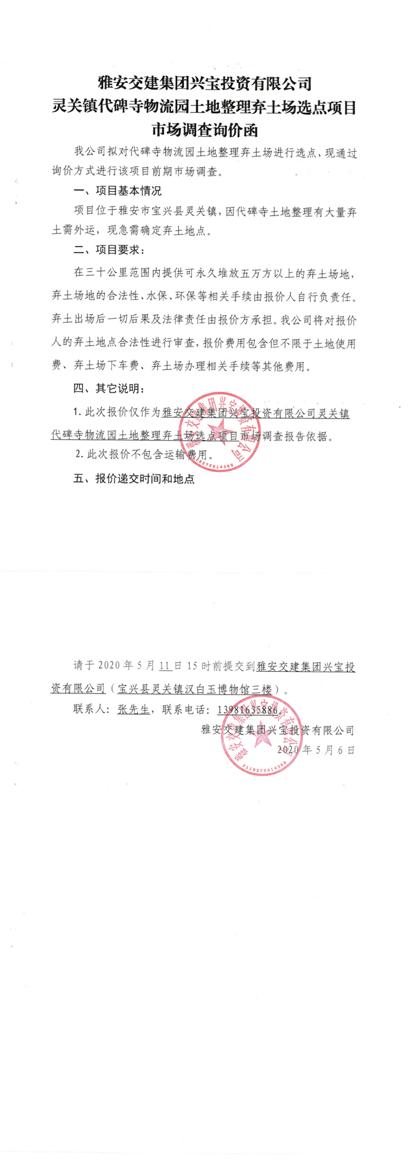 雅安交建集團(tuán)興寶投資有限公司靈關(guān)鎮(zhèn)代碑寺物流園土地整理?xiàng)壨翀鲞x點(diǎn)項(xiàng)目市場調(diào)查詢價(jià)函