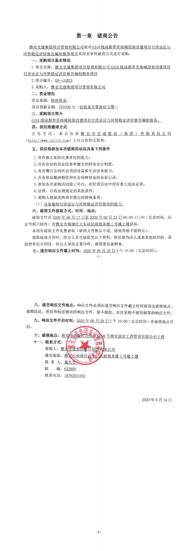 雅安交建集團項目管理有限公司G318線成都界至雨城段新改建項目行洪論證與河勢穩(wěn)定評價報告編制服務項目競爭性磋商公告