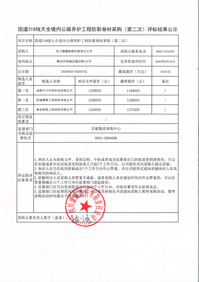四川康藏路橋有限責(zé)任公司國道318線天全境內(nèi)公路養(yǎng)護工程防裂卷材采購(第二次)評標結(jié)果公示