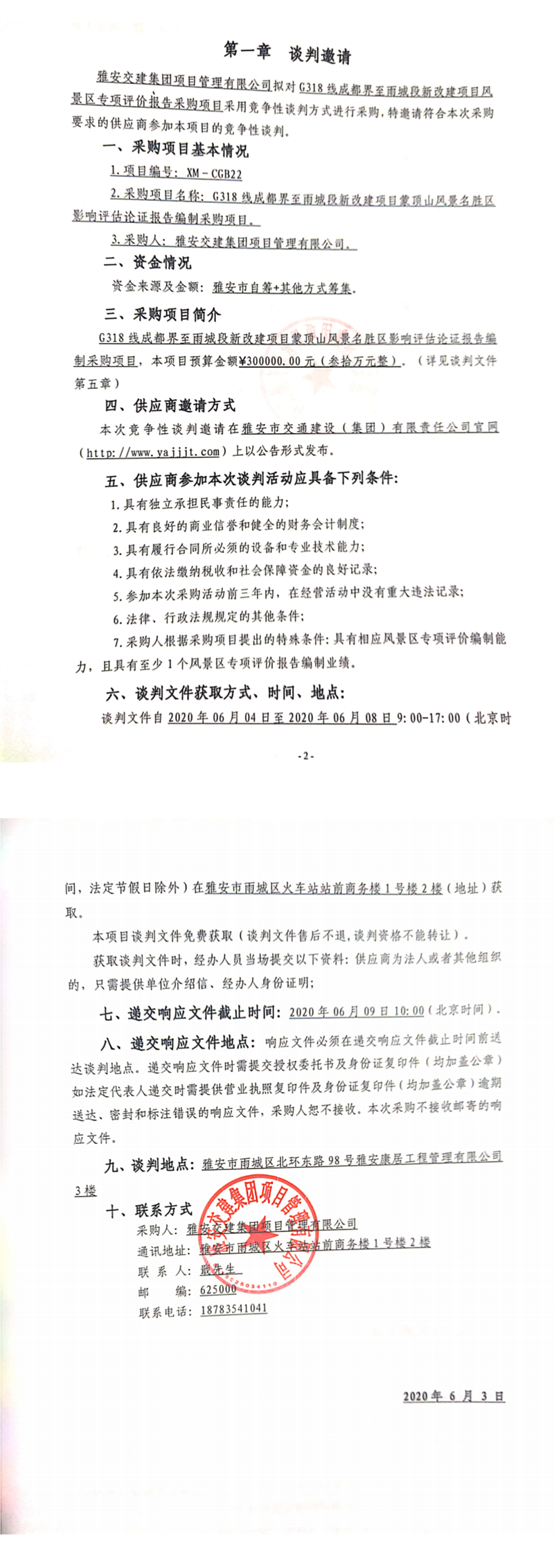 雅安交建集團(tuán)項(xiàng)目管理有限公司G318線成都界至雨城段新改建項(xiàng)目蒙頂山風(fēng)景名勝區(qū)影響評(píng)估論證報(bào)告編制采購項(xiàng)目競(jìng)爭(zhēng)性談判公告