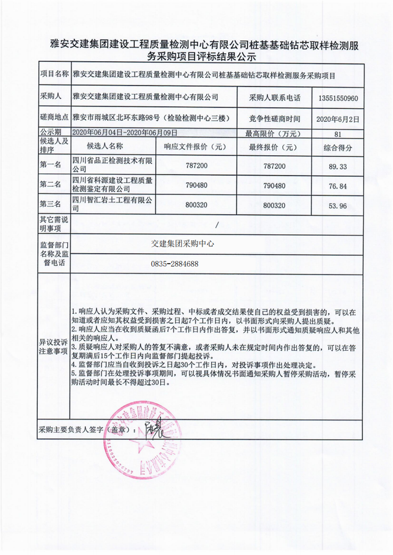 雅安交建集團建設工程質(zhì)量檢測中心有限公司樁基基礎鉆芯取樣檢測服務采購項目評標結(jié)果公示