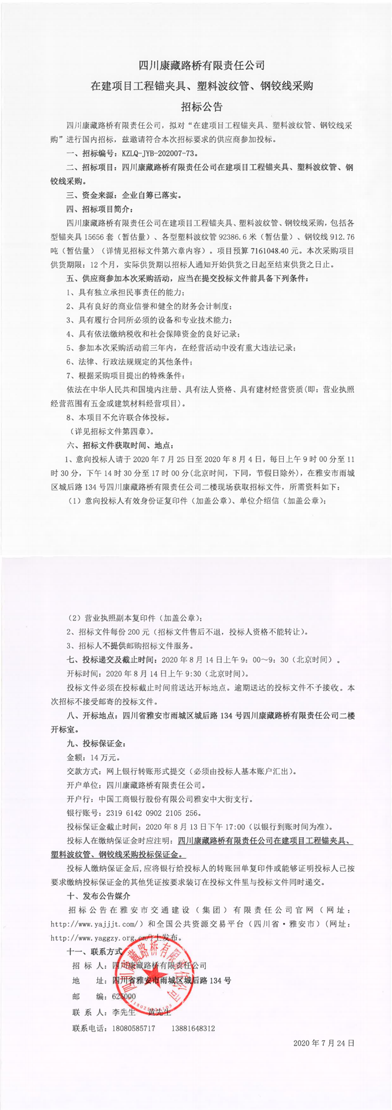 四川康藏路橋有限責任公司在建項目工程錨夾具、塑料波紋管、鋼鉸線采購招標公告