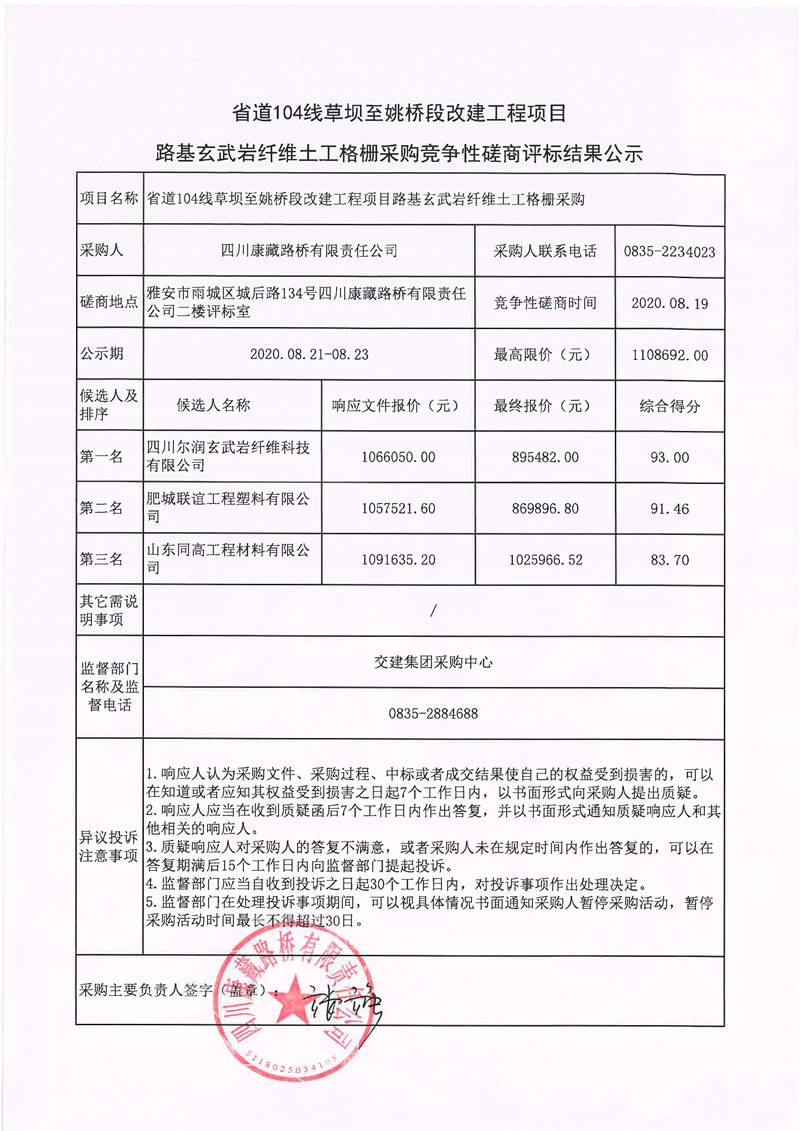 四川康藏路橋有限責(zé)任公司省道104線草壩至姚橋段改建工程項(xiàng)目路基玄武巖纖維土工格柵采購競(jìng)爭(zhēng)性磋商評(píng)標(biāo)結(jié)果公示