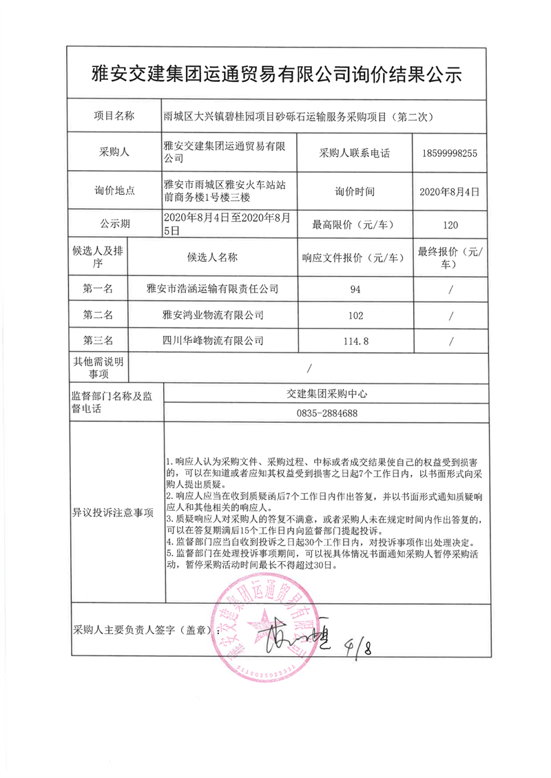 雅安交建集團運通貿(mào)易有限公司雨城區(qū)大興鎮(zhèn)碧桂園項目砂礫石運輸服務采購項目(第二次)詢價結果公示