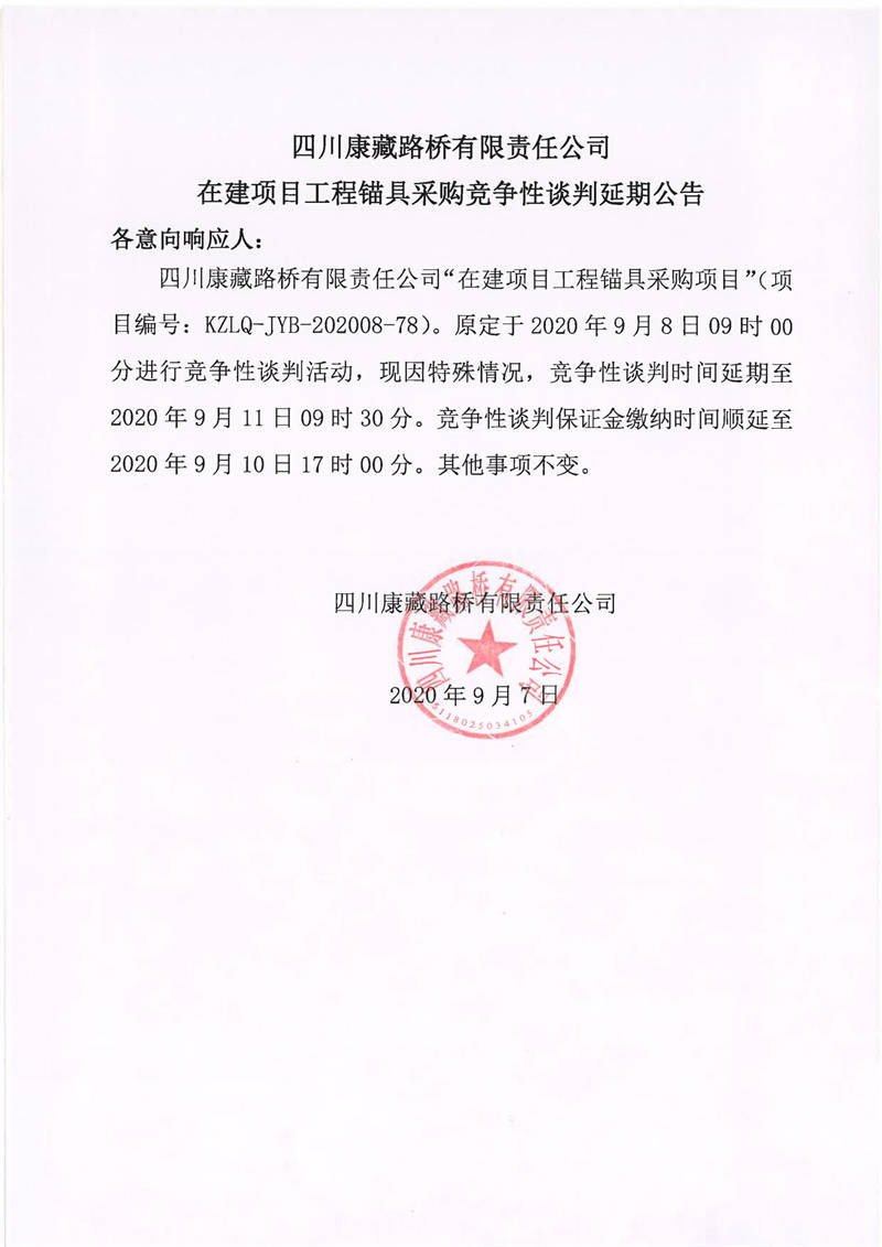 四川康藏路橋有限責(zé)任公司在建項(xiàng)目工程錨具采購競爭性談判延期公告
