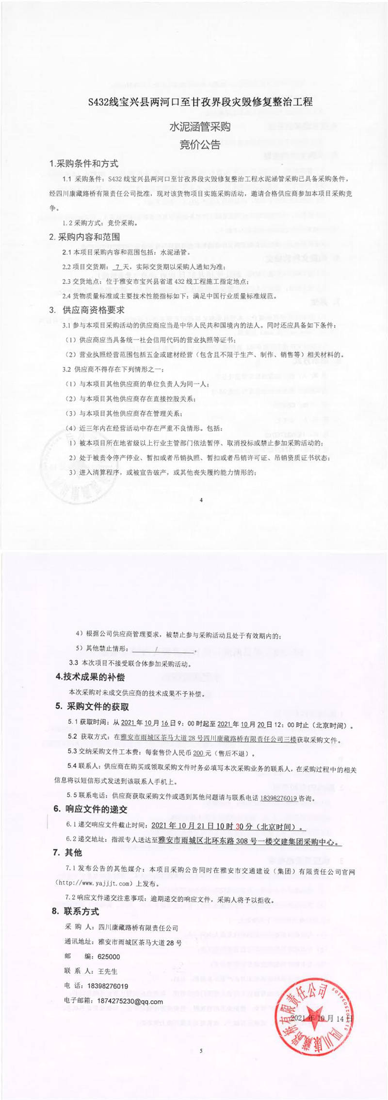 四川康藏路橋有限責任公司S432線寶興縣兩河口至甘孜界段災毀修復整治工程水泥涵管采購競價公告