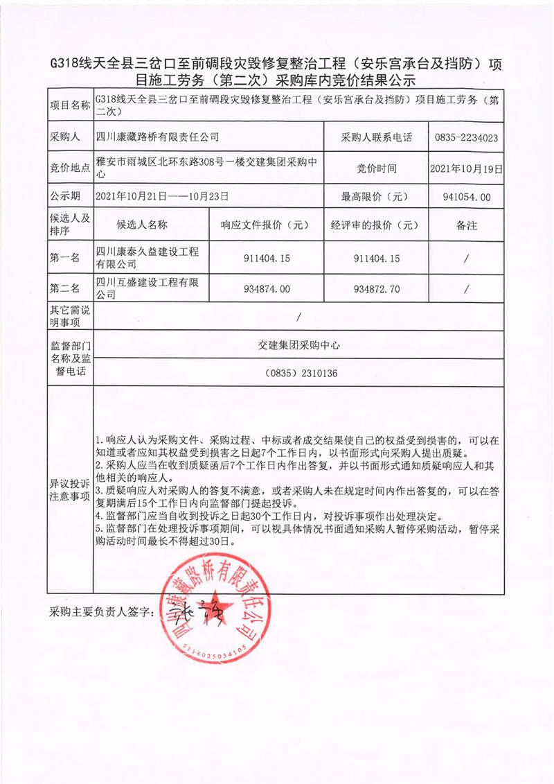 四川康藏路橋有限責(zé)任公司G318線天全縣三岔口至前碉段災(zāi)毀修復(fù)整治工程(安樂宮承臺及擋防)項(xiàng)目施工勞務(wù)(第二次)采購庫內(nèi)競價(jià)結(jié)果公示