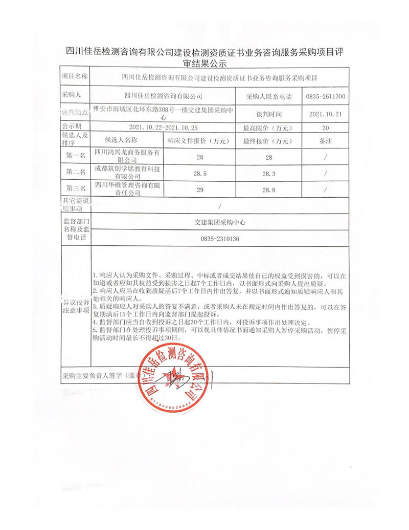 四川佳岳檢測(cè)咨詢有限公司建設(shè)檢測(cè)資質(zhì)證書業(yè)務(wù)咨詢服務(wù)采購項(xiàng)目評(píng)審結(jié)果公示