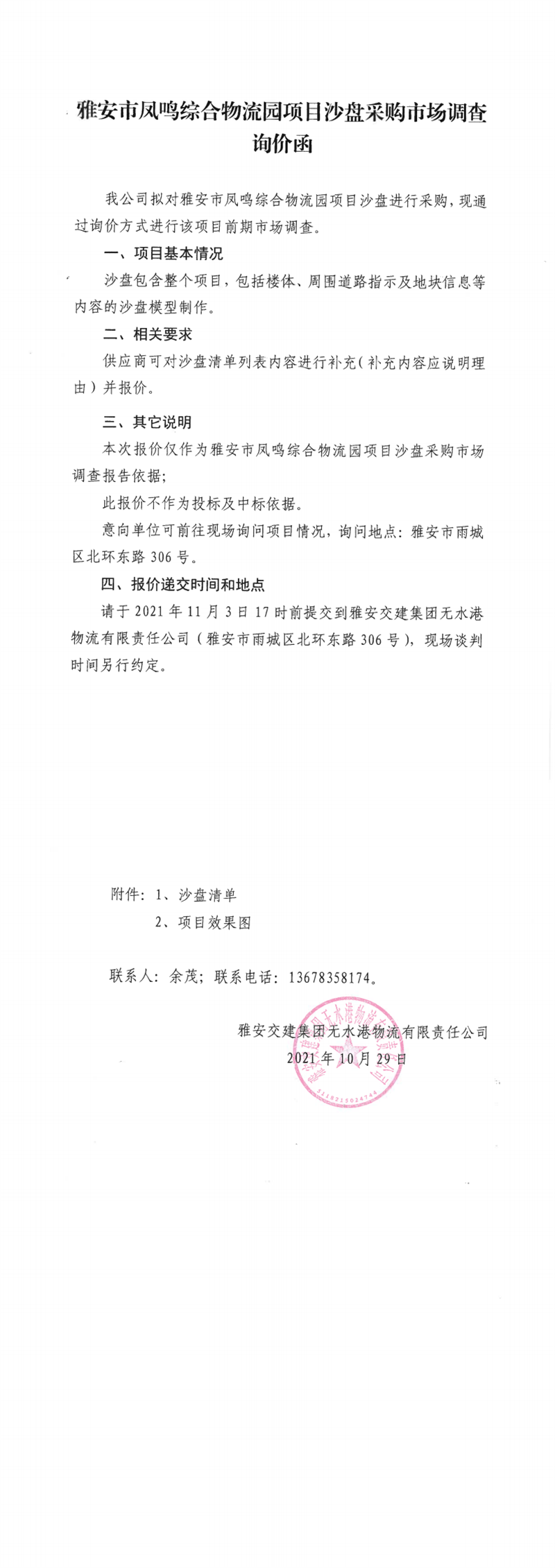 雅安交建集團(tuán)無水港物流有限責(zé)任公司雅安市鳳鳴綜合物流園項(xiàng)目沙盤采購市場調(diào)查詢價(jià)函