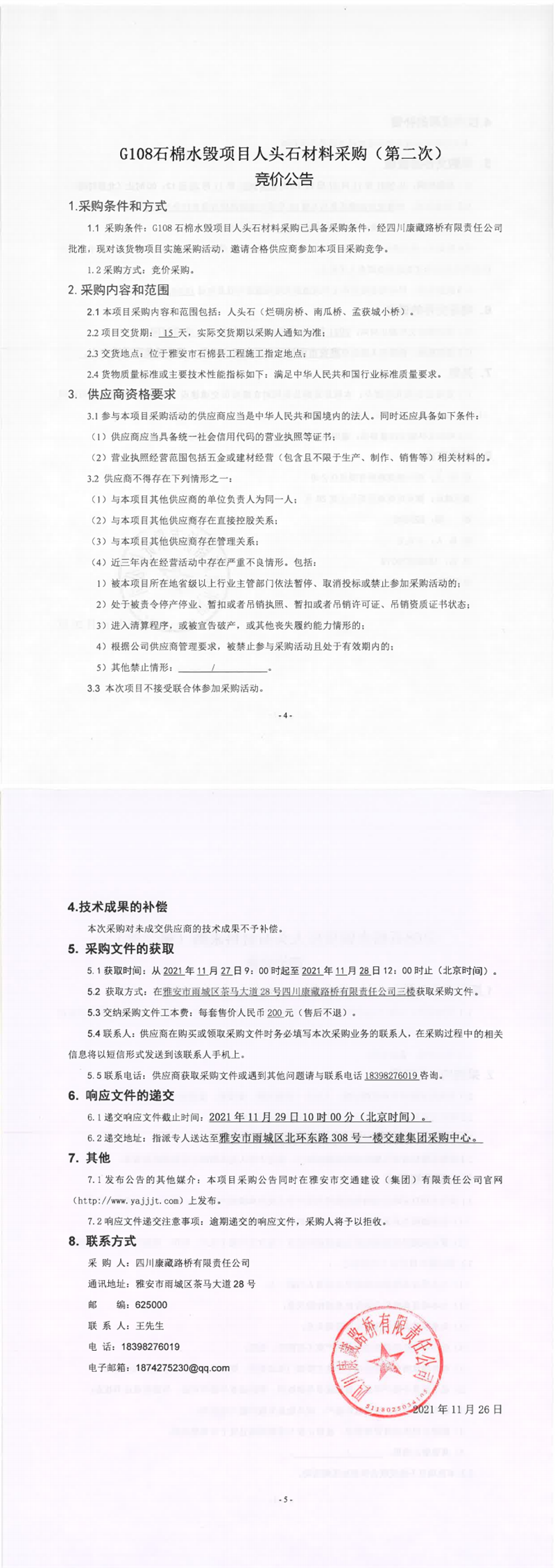 四川康藏路橋有限責(zé)任公司G108石棉水毀項(xiàng)目人頭石材料采購(gòu)(第二次)競(jìng)價(jià)公告