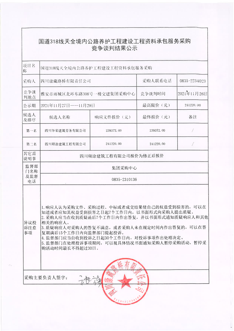 四川康藏路橋有限責(zé)任公司國(guó)道318線天全境內(nèi)公路養(yǎng)護(hù)工程建設(shè)工程資料承包服務(wù)采購(gòu)競(jìng)爭(zhēng)談判結(jié)果公示