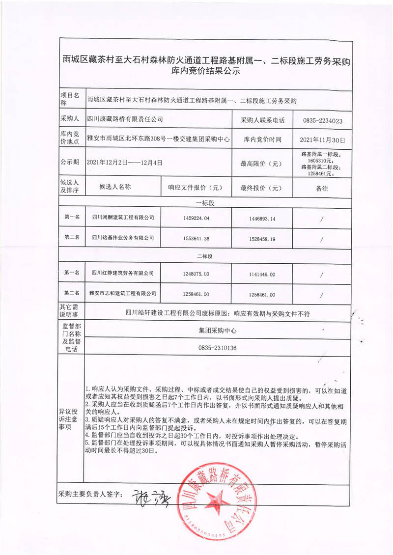 四川康藏路橋有限責任公司雨城區(qū)藏茶村至大石村森林防火通道工程路基附屬一、二標段施工勞務采購庫內(nèi)競價結(jié)果公示