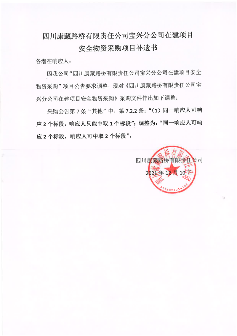 四川康藏路橋有限責(zé)任公司寶興分公司在建項目安全物資采購項目補(bǔ)遺書