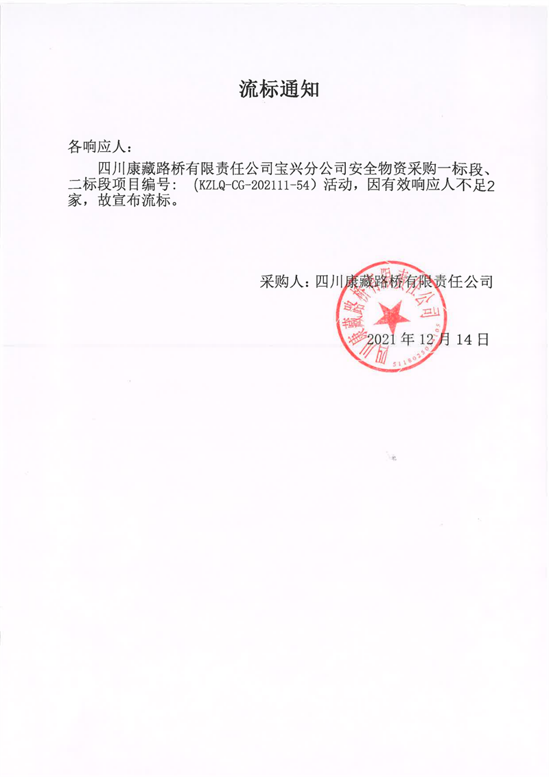 四川康藏路橋有限責任公司寶興分公司安全物資采購一標段、二標段項目流標通知