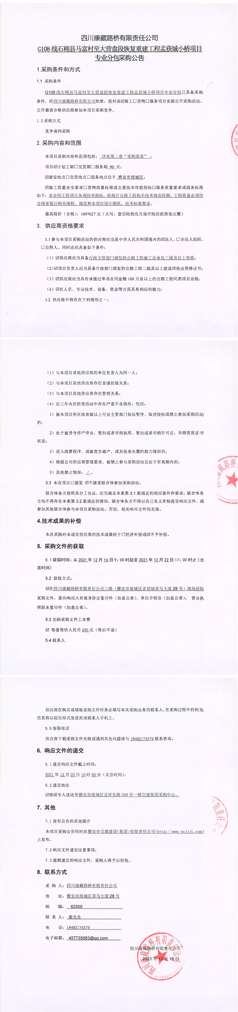 四川康藏路橋有限責(zé)任公司G108線石棉縣馬富村至大營(yíng)盤段恢復(fù)重建工程孟獲城小橋項(xiàng)目專業(yè)分包采購(gòu)公告