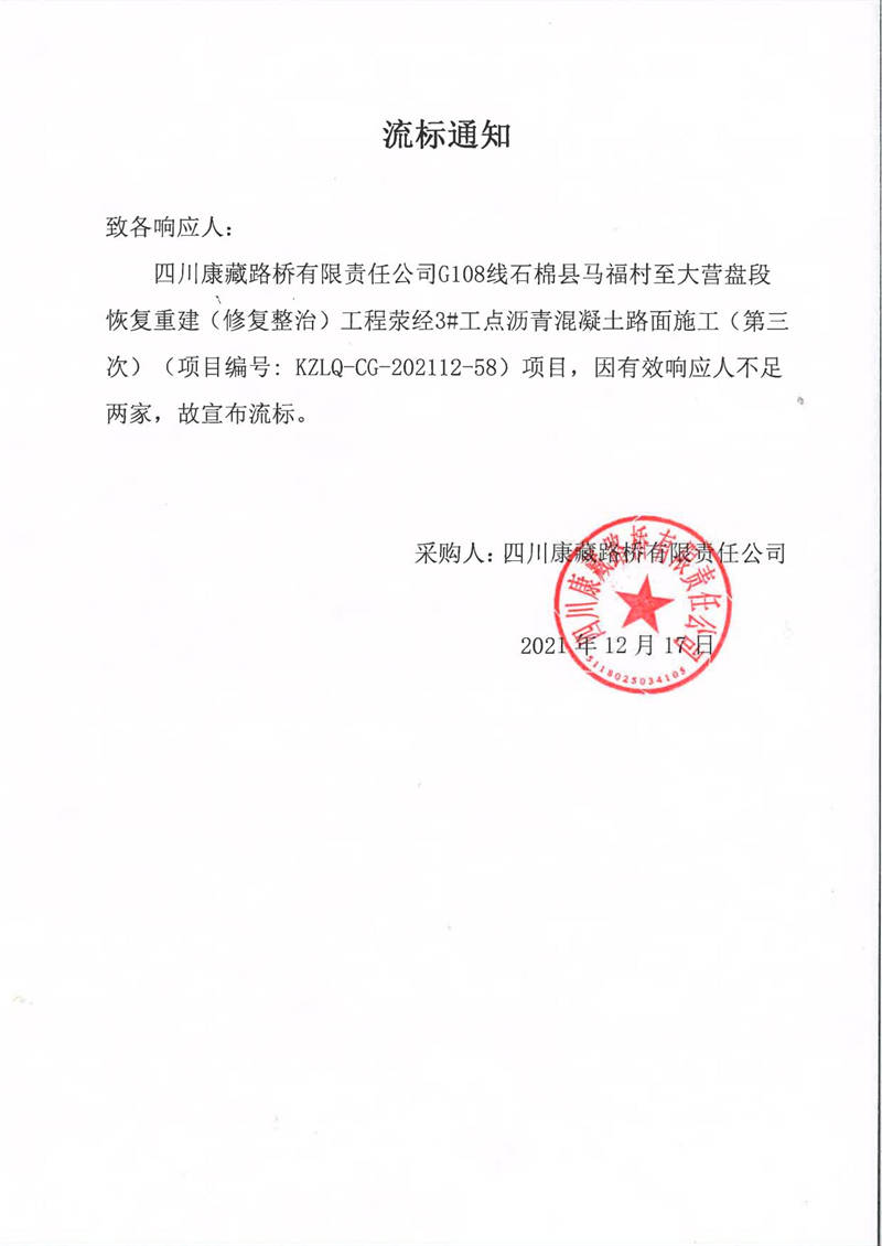 四川康藏路橋有限責任公司G108線石棉縣馬福村至大營盤段恢復重建(修復整治)工程滎經3#工點瀝青混凝土路面施工(第三次)流標通知