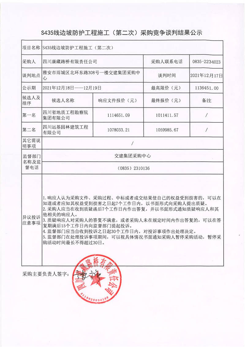 四川康藏路橋有限責任公司S435線邊坡防護工程施工(第二次)采購競爭談判結果公示