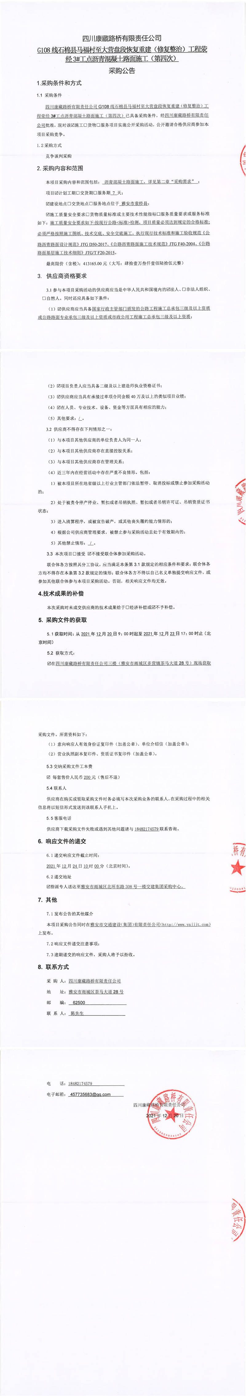 四川康藏路橋有限責任公司G108線石棉縣馬福村至大營盤段恢復重建(修復整治)工程滎經3#工點瀝青混凝土路面施工(第四次)采購公告