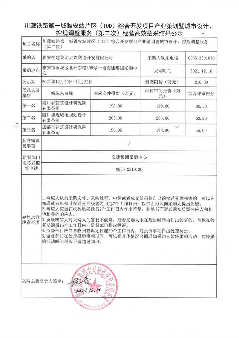 雅安交建集團(tuán)大興交通開發(fā)有限公司川藏鐵路第一城雅安站片區(qū)(TOD)綜合開發(fā)項(xiàng)目產(chǎn)業(yè)策劃暨城市設(shè)計、控規(guī)調(diào)整服務(wù)(第二次)經(jīng)營高效招采結(jié)果公示