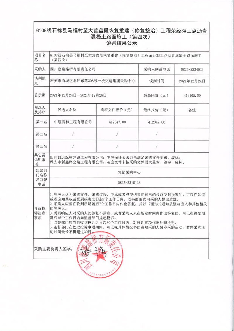 四川康藏路橋有限責(zé)任公司G108線石棉縣馬福村至大營(yíng)盤(pán)段恢復(fù)重建(修復(fù)整治)工程滎經(jīng)3#工點(diǎn)瀝青混凝土路面施工(第四次)談判結(jié)果公示